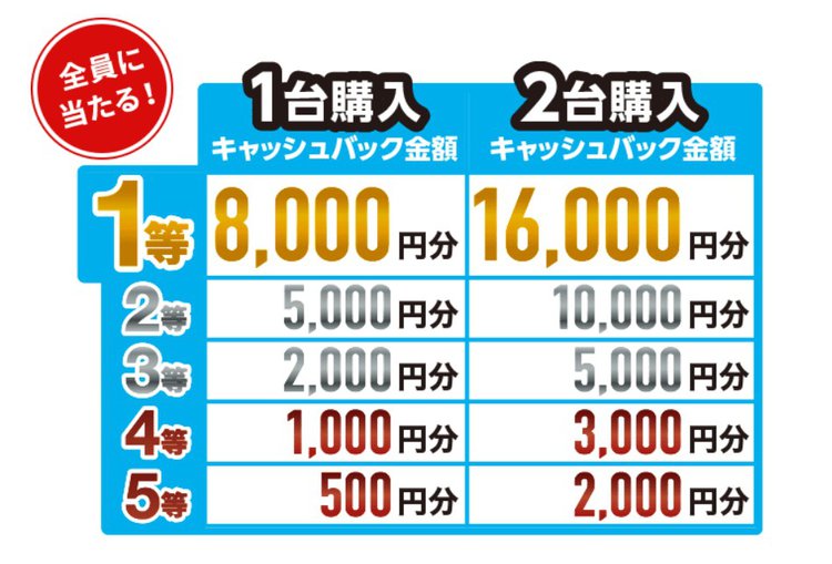 抽選は購入前に事前に実施する方式で、エントリーサイトからLINE登録/友だち認証を行うことで参加できる。8,000円/5,000円/2,000円/1,000円/500円のいずれか一つが必ず当選。また、2台同時購入として申し込むこともでき、その場合キャッシュバック金額は最大16,000円となる。