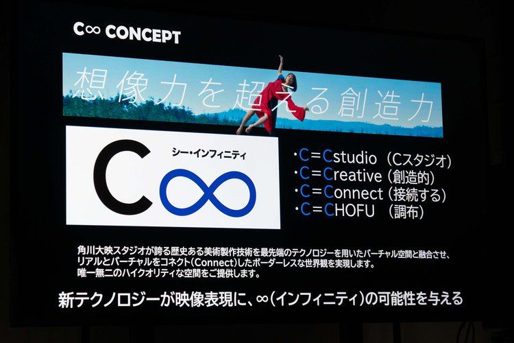 シー・インフィニティ(C∞)は、旧No.Cスタジオをリニューアルして設立された。「C」は、Cstudio(Cスタジオ)/Creative(創造的)/Connect(接続する)/CHOHU(調布)といった意味を備えている。角川大映スタジオが誇る歴史ある美術製作技術と、最先端のテクノロジーを用いたバーチャル空間を融合させ、リアルとバーチャルをコネクトさせたボーダレスな世界観を実現しているとしており、「新テクノロジーが映像表現に、“インフィニティ”の可能性を与える」というコンセプトを備え、唯一無二のハイクオリティな空間を提供するとアピールした。