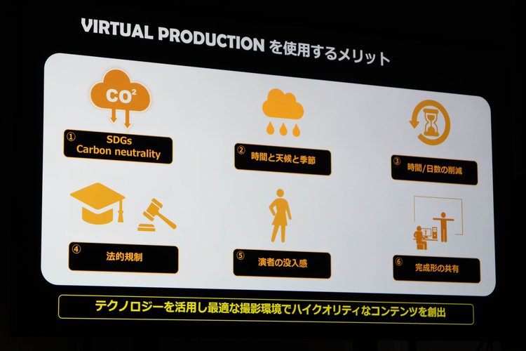 バーチャルプロダクションを利用するメリットは多く、ひとつはロケーション撮影では移動や暖房器具などで膨大な燃料を使用するが、そういった部分から発生するCO2の削減に繋がる。また、シー・インフィニティでは再生可能エネルギーを使用していることもアピールした。他にも、日照時間や天候、季節などの撮影環境に左右されない、撮影時間・撮影日数の削減、カーアクションなど撮影の許可を得なければいけない法的規制に縛られない、実際に背景があることによる演者の没入感の保持、そして完成形に限りなく近い映像を全スタッフが確認しながら撮影できるためクオリティの向上に繋げられるなど多くのメリットを有している。