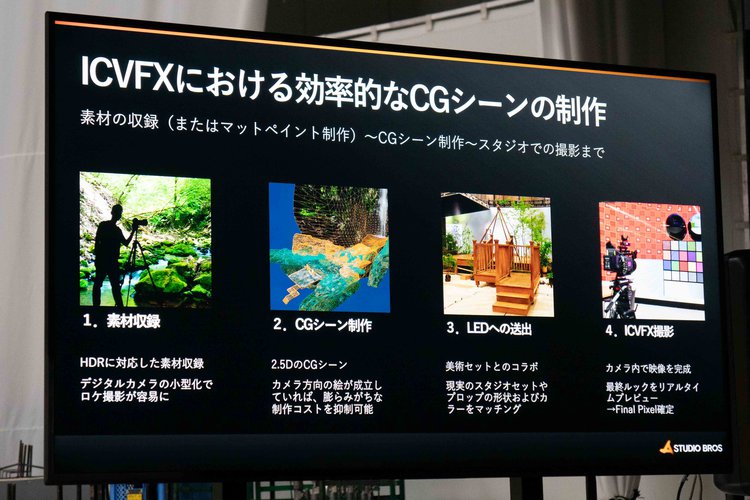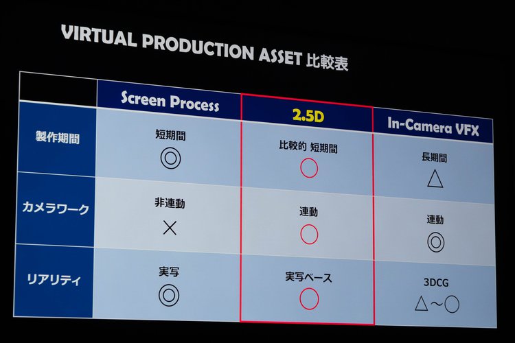 今回の説明会では、新たな撮影手法として「2.5D」と称した撮影のデモを実施した。実写ベースの2.5D空間を使用することで、フォトリアルな世界でIn-Camera VFXを組み込むことができるという。製作期間を比較的に短期間にすることができ、カメラワークを連動させられるため、3DCGよりもリアリティの高い映像制作が可能なことがメリットだとしている。