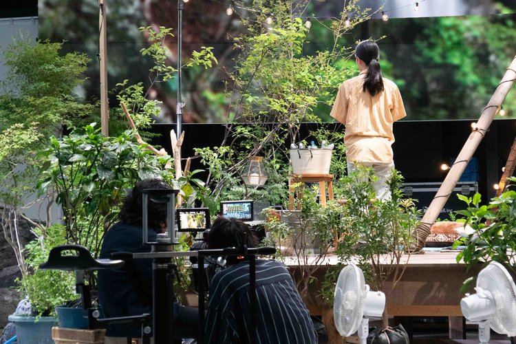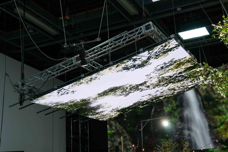 デモでは、LEDディスプレイに奥多摩で撮影した実写映像と、その実写映像をもとにしたカメラワークと連動できるCG映像を映し出し、手前にグランピングのセットを組んだ環境で撮影を行った。LEDディスプレイとCGの境界線には砂利と岩場を組むことで、違和感のない繋がりを演出している。