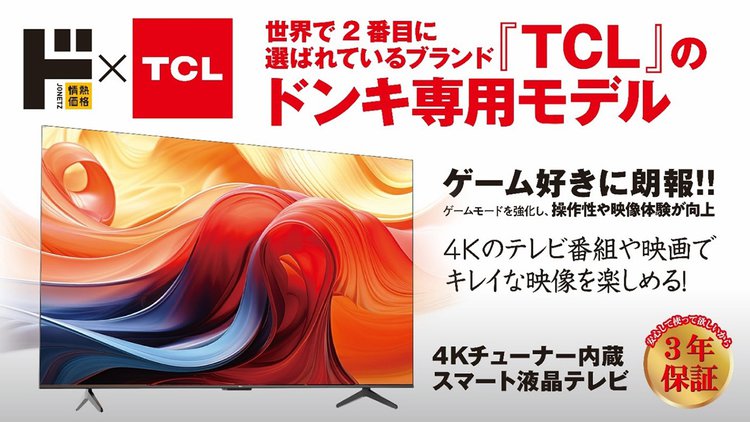 ドン・キホーテは、オリジナルブランド「情熱価格」より、TCLと共同開発した「4Kチューナー内蔵スマートテレビ」を全国のドン・キホーテ系列店舗にて販売を開始した。ラインナップ、および税込販売価格は下記の通り。