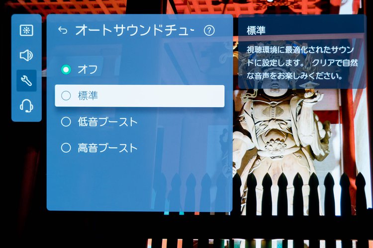 また、視聴環境の音響特性を測定し、適した音場調整を自動で行う「オートサウンドチューニング」機能をはじめ、音量レベルが異なる映像を切り替えても音量を一定にキープできる「オートボリュームレベリング」、音の輪郭を明瞭にするトーン補正を施す「AIクリアサウンド」、音域ごとに調整して全体のサウンドバランスを整える「オートバランスコントロール」といった高音質機能も実装している。