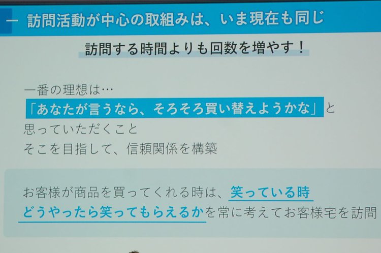 一番の理想は「あなたが言うなら、そろそろ買い替えようかな」と思っていただけることだと語り、「お客様が商品を買っていただけるのは笑っているとき。難しい顔をしているときには買ってもらえません。どうやったら笑ってもらえるかを常に考え、訪問活動を続けています」と言葉を続けた。