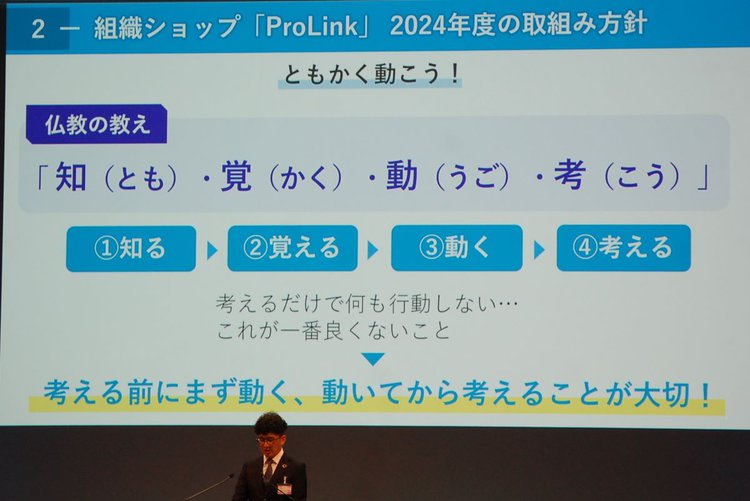 組織ショップの取り組みとして、千葉県を拠点に12の加盟店で展開するProLinkは、買い手・売り手・地域のみならず、地域と未来を加えた“五方”よしの精神をモットーに地域一番店を目指している。河野氏は、仏教の教えでもある「知(とも)・覚(かく)・動(うご)・考(こう)」を取り組み方針に、「考えるより先に動くことがポイント。考えるだけで何も動かないのが一番よくないこと」だと語る。
