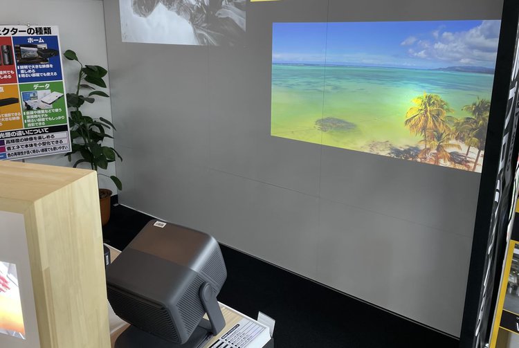 コーナー内にはさらに、天井にシーリング型が2台、床に短焦点型が1台展示されている。モバイルタイプとは購入層や購入動機が異なり、シーリング型は事前に検討された上で、購入意欲を持って来店されるという。新築や転居のタイミングが多く、「機種の選択肢が増えれば、需要ももっと膨らんできます」と予測。