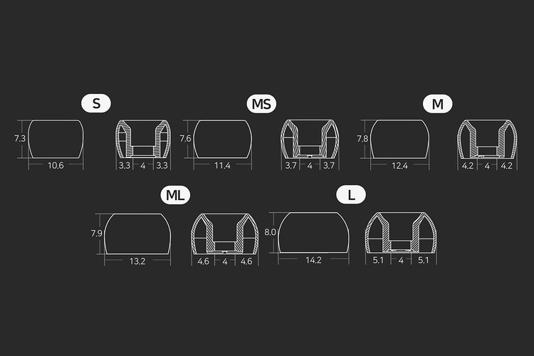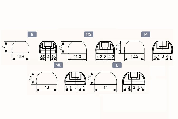 各サイズの直径は、Sサイズが10.6mm/MSサイズが11.4mm/Mサイズが12.4mm/MLサイズが13.2mm/Lサイズが14.2mm。対応するイヤホンノズル径は4 - 6mm。