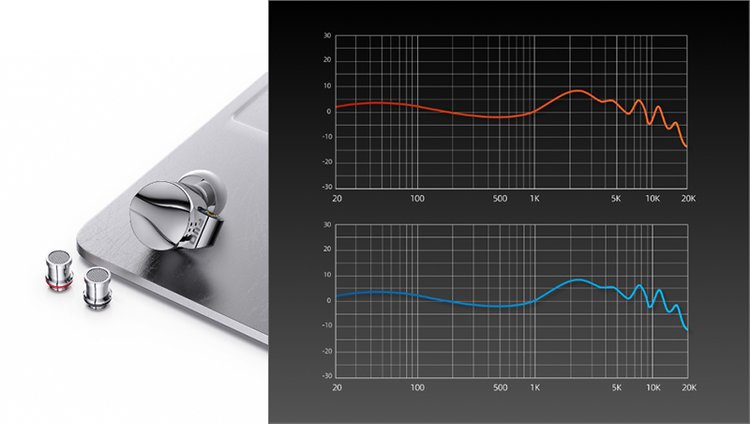 FD5の12mmドライバーからさらに大口径化した、新開発の13.8mm径ダイナミックドライバーを搭載。振動板の有効振動面積はFD5と比較して約40%増加し、振動板で駆動する空気量を増大させた。
