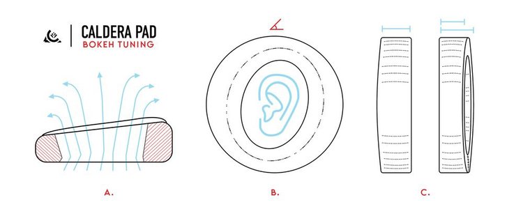 イヤーパッドには、本モデル用に調整を施したブランド独自の「Caldera Pads」を採用。耳の形状にあわせて回転する楕円形の開口部を備え、厚みや高さも部位ごとに調整することで隙間なくフィット。さらに独自のひだ付きデザインにより、空気の流れもスムーズに保つとしている。