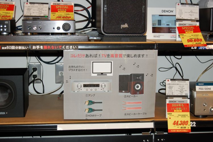 ノジマのテレビコーナーでは、オーディオスクエアで取り扱うスピーカーをテレビに組み合わせた展示・提案も随時行っている。「3万円クラスの小さなブックシェルフスピーカーでも、全く音が違うんですよ」と語る白井氏。「テレビの音を改善するために仮に10万円の予算があるとして、アンプ+スピーカー(+ラック)でオーディオを組むか、10万円クラスのサウンドバーの上位モデルにするか。お客様のニーズや楽しみ方で最適解は異なってくると思います」。