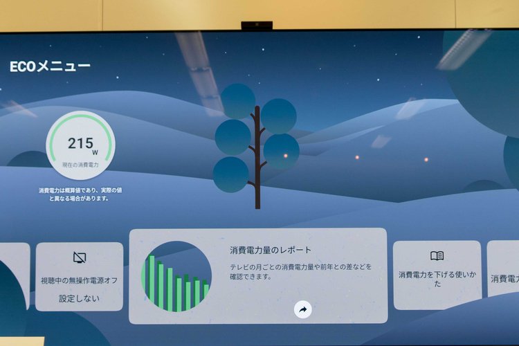 従来モデルから搭載されている「ECOメニュー」では、省電力設定や明るさセンサーの調整が手軽に操作できる仕様になっていたが、新しく消費電力をリアルタイムで可視化できるようになったほか、年次/月次/週次/日時で使用電力量を確認できるようになっている。