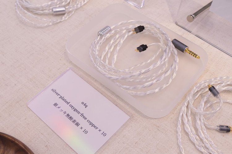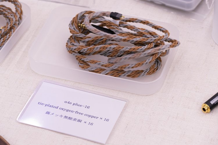 フラグシップとなる錫メッキ無酸素銅線を16芯で採用した「α4e-plus-16」や、もともと須山歯研の「FitEar TITAN」のために開発され、その後改良を重ねて開発したという銀メッキ無酸素銅線を10芯で採用したという「α4q」といったリケーブルを展示しており、比較しながらの試聴が可能だ。