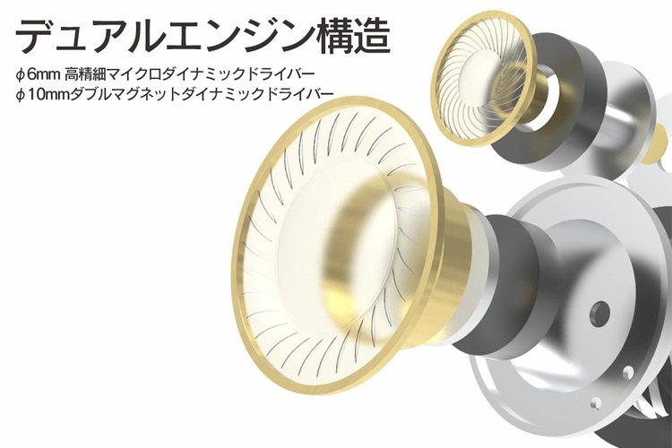 ドライバーユニットは、6mm径の高精細マイクロダイナミックドライバーと10mm径のダブルマグネットダイナミックドライバーの2基を搭載。いずれのドライバーも新規開発の複合ポリマーダイアフラムと合金サスペンション技術が導入されている。このデュアルドライバーのシームレスな連携によって、深みのある豊かな低域を確保しながら、強力な分解能と鮮明なサウンドを実現したとしている。