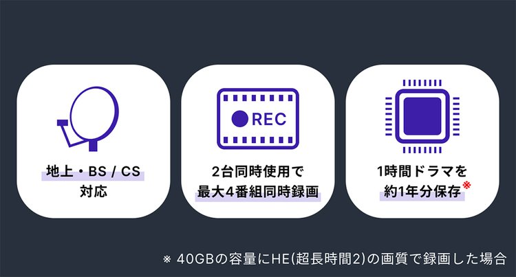 クラウドストレージと契約しない場合も、PCの内蔵ストレージや外付けHDDなどへのローカル録画が可能。国産ハードウェアトランスエンコーダーの搭載により、PCのCPUに負荷をかけず高速録画処理が行える。録画番組はBlu-rayやDVDなどに書き出したり、家庭内のWi-Fiネットワークを通じてスマートフォン/タブレットからリモート視聴できる。