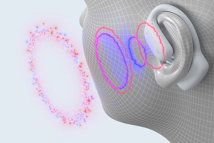 ハウジングから伸びるリングパーツが耳のくぼみ(耳甲介)にフィットし、浮遊した骨伝導ドライバーユニットの音を効率よく聴覚器官に伝える独自構造「リングフィットボーンコンダクション」を採用。空気の振動によって伝わる周囲の環境音を邪魔することなく、自然なリスニングが楽しめるとする。