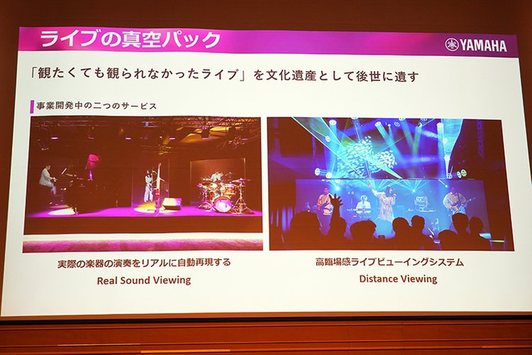 ライブの真空パックにおける取り組みとして、実際の楽器の演奏をリアルに自動再現する「Real Sound Viewing」、および高臨場ライブ・ビューイングシステム「Distance Viewing」の2つのサービスを事業開発。これらを支える技術として、音響/映像/照明/舞台演出などのデータ形式を統一化する記録・再生システム「GPAP(General Purpose Audio Protocol)」などを開発、実証を重ねてきたとする。