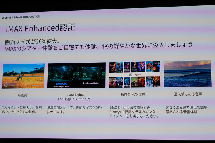 HORIZON S Maxの最大のトピックなのが、プロジェクターで初めてIMAX Enhanced対応を実現したこと。IMAX Enhencedは4K/HDRによる明るく鮮明な映像を備えていることはもちろん、IMAX独自の拡張アスペクト比である1.9:1への対応、DTSによる迫力満点な臨場感豊かな音を体験できることが特長であり、現状ではDisney+などのIMAX Enhanced収録の作品で、そのハイクオリティさを堪能することができる。
