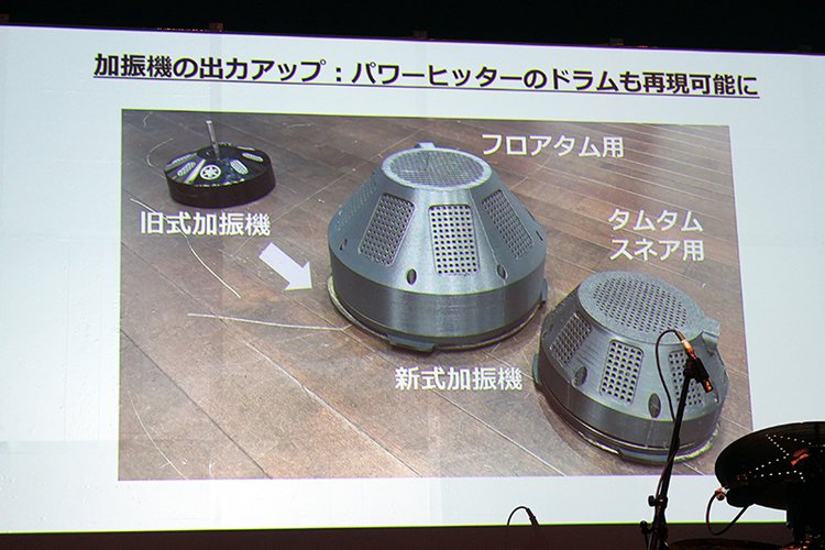 ハイハットの再現を例にすると、センサーによるペダル演奏のデータ化と演奏データからの動作再現、そしてスティックで叩いた際に発生するシンバルの振動を加振機で再現するという仕組みだ。生演奏時の音と比較したデモ音源では、ペダル操作でシンバルを開閉した際の細かな音のニュアンスや強弱までもが忠実に再現されているように聴こえた。