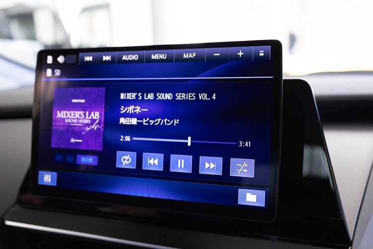 発表会の最後に、トヨタのプリウスに搭載されたトップモデル「CN-F1X10C1D」の音質を確認した。ボリュームコントロールはアプリ上、もしくは本体上部の物理ボタンから設定できるようになっている。角田健一ビッグバンドの「シボネー」を聴くと、中高域の伸びやかさや見通しの良さはなかなかに印象的。今回は音楽だけだったが、YouTube等のネット動画を見る場合の音質にも期待ができそうだ。