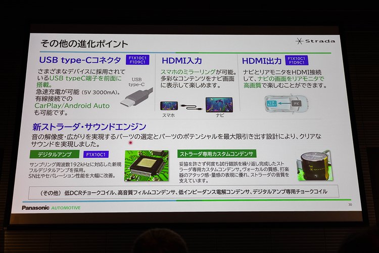 開発担当の村田氏によると、今回のストラーダのために音質に関わる回路はすべて新規で設計したという。今まではオーディオとその他の機能を一緒に設計していたが、今回は音質を優先した設計を実現、デジタルアンプを搭載することで歪み率などの諸特性の改善も狙ったと説明する。