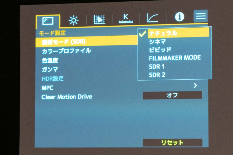 今回、ライトなユーザーにとっても使いやすくしたいという意向の基、使用感を高める仕様としてGUIも改良している。トップに「画像設定」「HDMI設定」「設置設定」といった3つの入り口を設けており、ユーザーの目的にあったメニュー項目に進みやすくなっている。