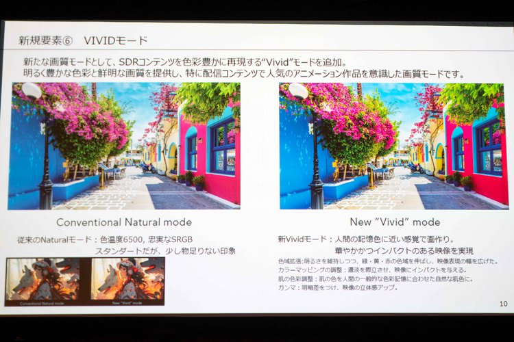 「Vivid」モードの細かい調整内容として、明るさを維持しながらのRGBの色域拡張、濃淡を際立たせたカラーマッピング調整、人間の一般的な色彩記憶に合わせた肌色調整、そして明暗差を付けることで立体感を高めるガンマ調整を行っている。特にアニメーション作品との相性がよく、音楽ライブやスポーツなどのビデオコンテンツでも大きな効果を発揮するという。