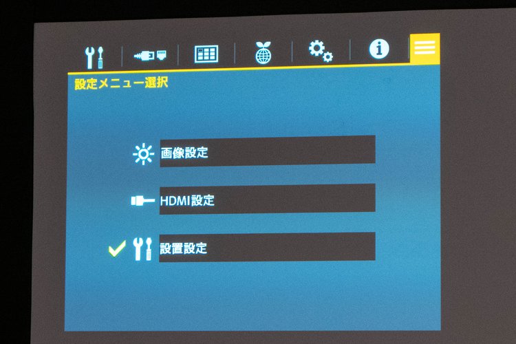 今回、ライトなユーザーにとっても使いやすくしたいという意向の下、使用感を高めるためにGUIも改良。トップに「画像設定」「HDMI設定」「設置設定」といった3つの入り口を設け、ユーザーの目的にあったメニュー項目に進みやすくした。