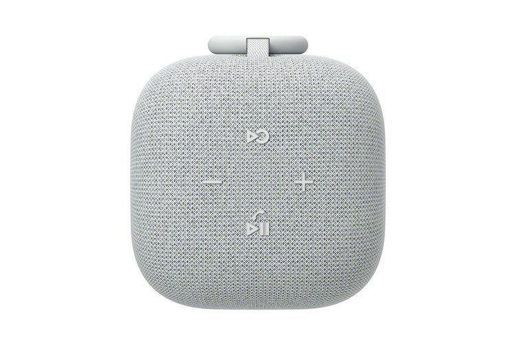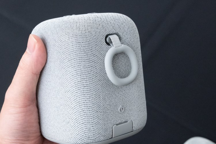 外装には部屋の調度になじませやすいファブリック素材を採用。IPX4等級の防滴性に加え、持ち運び用に着脱可能のリング型ストラップも備えている。外形寸法は約84W×110H×90Dmm、質量は約520g。