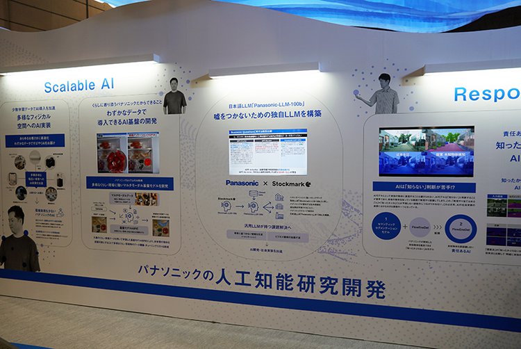 また、大規模言語モデル(LLM)の面では、ストックマーク社による生成AIモデル「Stockmark-LLM-100b」に対し、パナソニックが保有する社内情報を追加事前学習させた同社グループ専用の日本語LLM「Panasonic-LLM-100b」を構築したと説明。これにより、汎用LLMの課題である事実に基づかない情報生成や、ビジネス領域の知識不足といった課題解決を促し、AIの開発・社会実装を加速させるとアピールしていた。