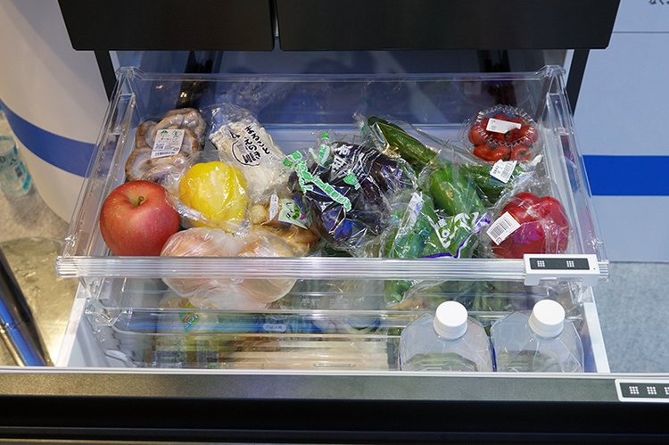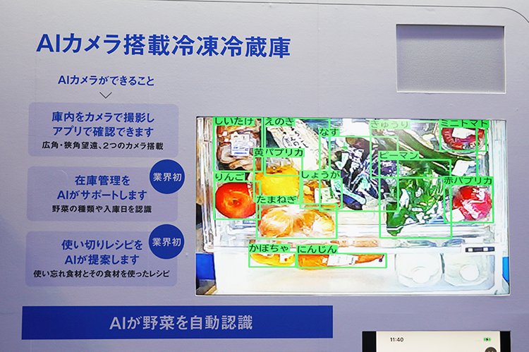 そしてAIの社会実装事例の展示として、同社のAIカメラ搭載冷凍冷蔵庫を紹介する。AIテクノロジーを活用した野菜自動認識機能により、庫内の在庫管理や、先に消費した方が良い野菜とそれを用いたレシピを提案するデモンストレーションを実施している。