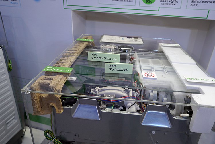 また家電類の取り組みとして、ドラム式洗濯乾燥機「GX:Green Transformation」の取り組みを展示。主に再生プラスティックの使用に加えて、梱包材に新たにパルプモールドを使用することで発泡スチロールレスを実現した点をアピール。担当者によればパルプモールドの材料や形状を最適化したことで、発泡スチロールと変わらない耐久性を実現できたのだという。