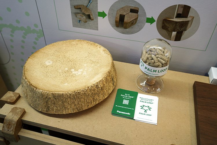さらに資源枯渇問題への対応策として、地球上の限られた資源を有効活用した、新たな資源循環に貢献する素材の開発・展開。その事例として、植物由来のセルロースファイバーを高濃度に樹脂に混ぜ込んだサステナブルな素材である「kinari」や、、リサイクル可能なポリプロピレン繊維強化樹脂「PPFRP」、アブラヤシの廃材から作る木材に代わる新しい材料「PALM LOOP」を、導入事例と共に紹介していた。