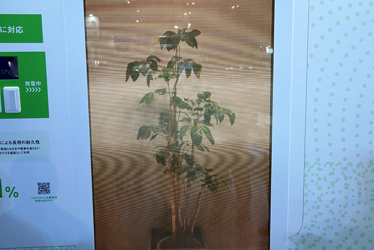 続いてSustainabilityのブースでは、持続可能な社会の実現に向けた地球環境課題や地域課題を解決する取り組みを多数展示。その1つが、独自の材料技術やインクジェット塗布工法で発電層をガラス基板上に直接形成した、ガラス建材一体型の「ペロブスカイト太陽電池」だ。