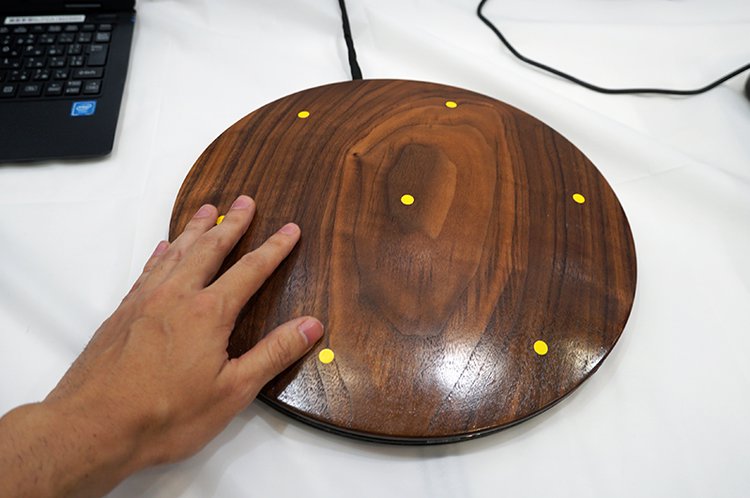 また、フォスター電機と共同開発している、曲面形状の木材から音が奏でられる「曲面木材スピーカー」の試作機も展示。センサーが曲面形状に対応していることで、触れた場所によって任意の楽曲や環境音を再生できる様子が確認できる。担当者によれば、タッチ操作によるボリューム調整や曲送りといったことも実現可能とのことで、操作ボタン等を排除できることでインテリア性も確保できるとしていた。