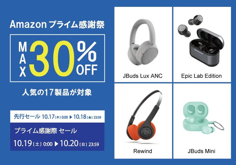 Amazonプライム会員が対象の大型セール「プライム感謝祭」が、今週末10月19日(土)、20日(日)の2日間にわたって開催。本日17日(木)からは一部製品がひと足早く安くなる「先行セール」がスタートしている。イヤホン/ヘッドホンブランドJLab Audioも本セールに参加し、完全ワイヤレスイヤホンやBluetoothヘッドホンを最大30%オフで出品している。