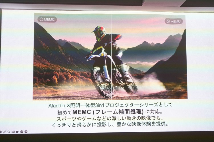 高画質機能では、照明一体型3in1プロジェクターとして初めて「MEMC(フレーム補間処理)」技術を採用した。スポーツやゲームなど、被写体の動きが激しい映像コンテンツでも、くっきりと滑らかな映像で再生できることが特徴だ。