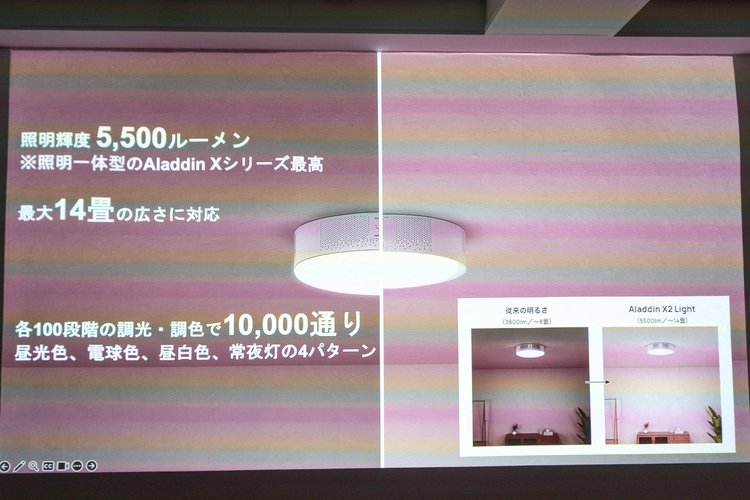 照明としては、上位機種と比較しても光量と機能の両面で大きくアップデートを図っている。Aladdin X2 Plusが最大3,800ルーメン/8畳対応のところ、本モデルは最大5,500ルーメン/14畳対応へとグレードアップ。光色は2,700 - 6,500Kまで100段階の調色が可能で、昼光色/電球色/昼白色/常夜灯といったパターンを備える。