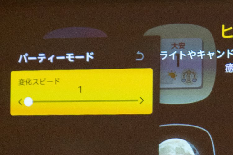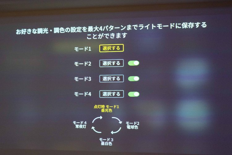新機能として、さまざまシーンに応じてライトの色を変化させたり、好みの配色を楽しむことができる「ムードライト」を採用。明るさや色合いを変えることができる「カラー」、プリセットパターンによって盛り上がりのある演出を行う「パーティー」、眠りに適したリラックスできる光を再現する「スリープ」という3つのモードを用意している。