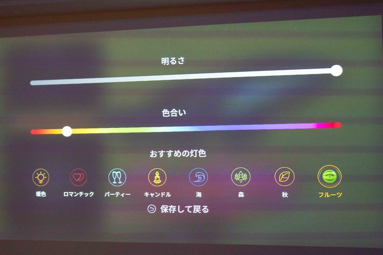 「カラー」モードでは、音楽コンテンツの音のリズムに合わせて光が自動で調整される「ミュージック」、映像コンテンツの色合いに合わせて調光される「ムービー」、ユーザーの好みに応じて明るさや色合いを設定できる「カスタム」設定を用意。カスタムでは、同社が開発するゲーム「スイカゲーム」と連動したライティングも搭載しており、ゲームプレイ中にスイカを作ることができると、特別なカラーパターンが楽しめるという。