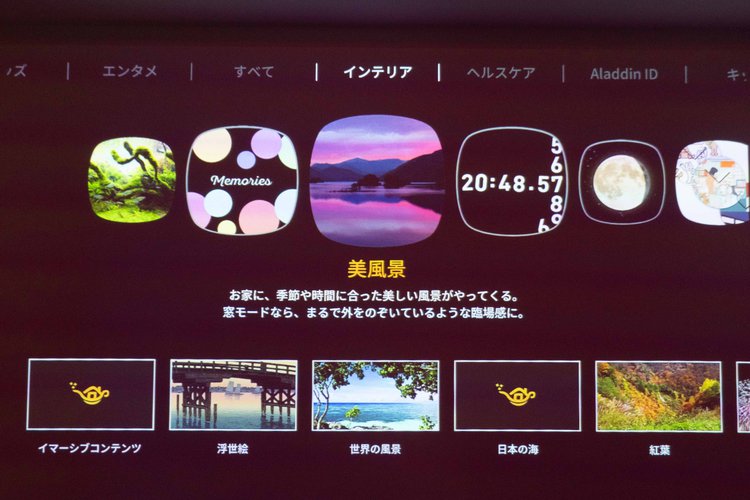 また、壁から18cmの距離で100型、最大で150型の大画面投写が可能。DCI P3 99%の広色域もカバーした。Aladdin Marca Maxは年内発売を予定しており、価格は40万円台の見込み。詳細は、後日改めてアナウンスするとのこと。