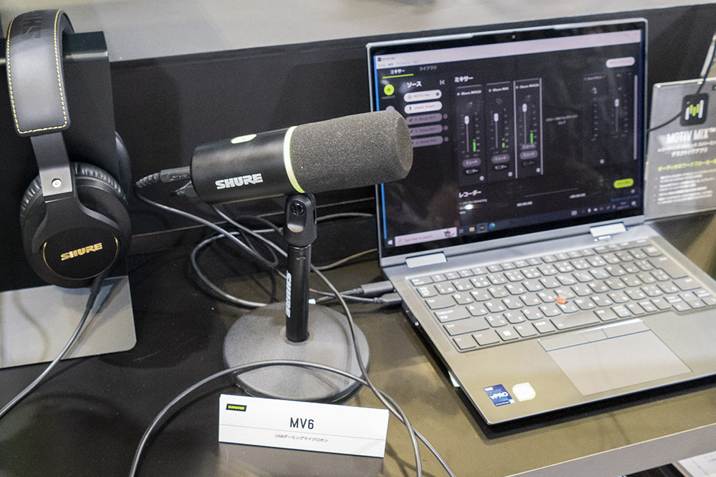 「コンテンツクリエーション」コーナーでは、配信やゲーミングといった用途に対応するコンシューマー向けマイクロフォンを展示しており、XLR/USB Type-C接続両対応のダイナミック型マイク「MV7+」や、USBゲーミングマイクのエントリー機「MV6」をラインナップしている。なかでもMV6は今年9月に発売されたばかりのモデルで、同ブランドを代表する「SM7」や「MV7」のデザインや技術を継承しており、エントリークラスながらプロのようなサウンドを実現したモデルだとのこと。