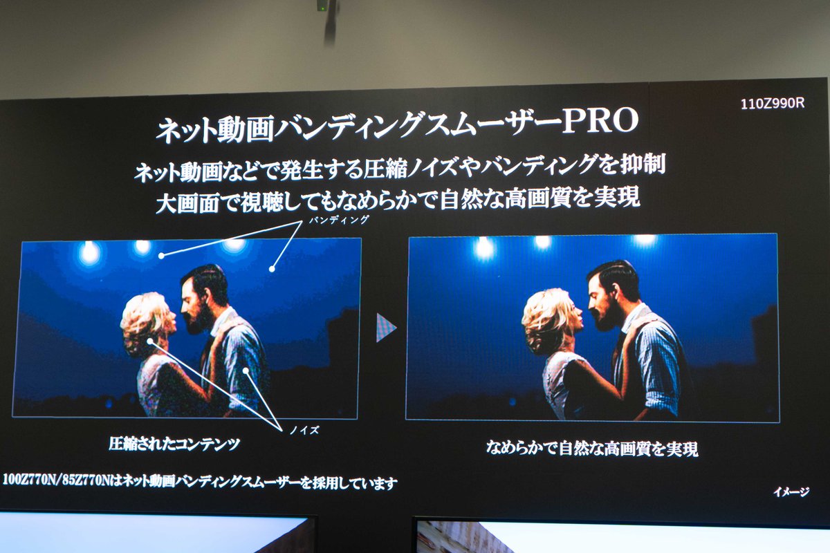 ネット動画向けの高画質機能として、「ネット動画バンディングスムーザーPRO」も搭載。ネット動画の圧縮された映像コンテンツで発生しやすいバンディングやノイズを抑制することで、なめらかで自然な映像を実現するという。また、大画面で視聴しても高画質を叶えるとしている。