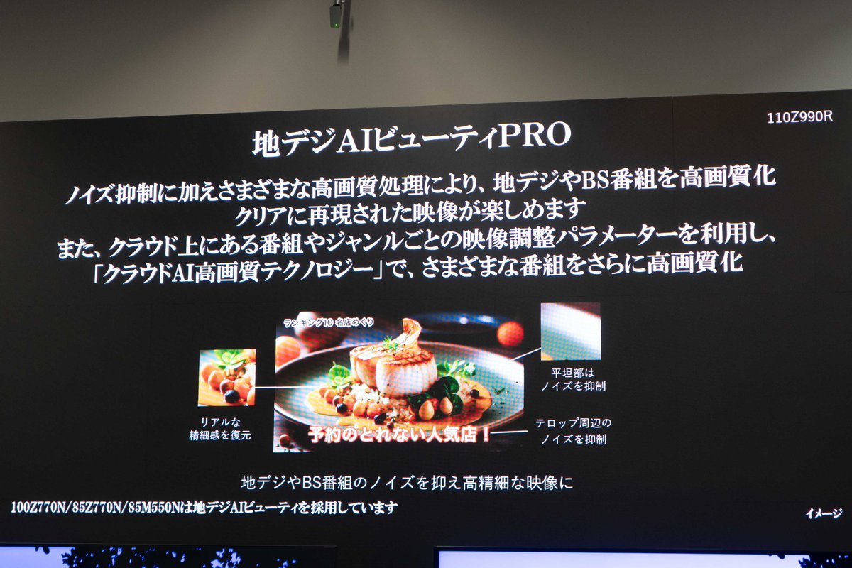 放送番組で効果を発揮する高画質機能では、地デジやBS番組のノイズを抑え、最適な高画質処理を自動で行うことで、クリアで高画質な放送番組の映像を楽しめる「地デジAIビューティPRO」を導入する。さらにクラウド上に地デジやBD番組のジャンルや番組タイトルごとの映像調整パラメーターをデータベース化して、番組視聴時にクラウドデータベースのパラメーターを反映する「クラウドAI高画質テクノロジー」も内蔵されている。