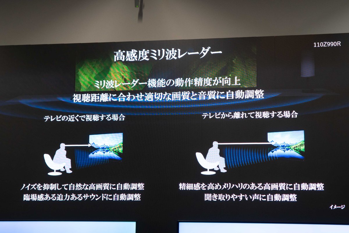 「新世代レグザエンジンZRα」ならではの機能として、「高感度ミリ波レーダー」によるセンシング技術も搭載している。視聴距離に合わせて適切な画質・音質の自動調整を可能としており、近距離視聴ではノイズを抑制して自然な映像、かつ臨場感と迫力のあるサウンドに調整。遠距離視聴では、映像の精細感を高めてメリハリのある映像に調整し、サウンドは声が聴きとりやすい音質に調整される。