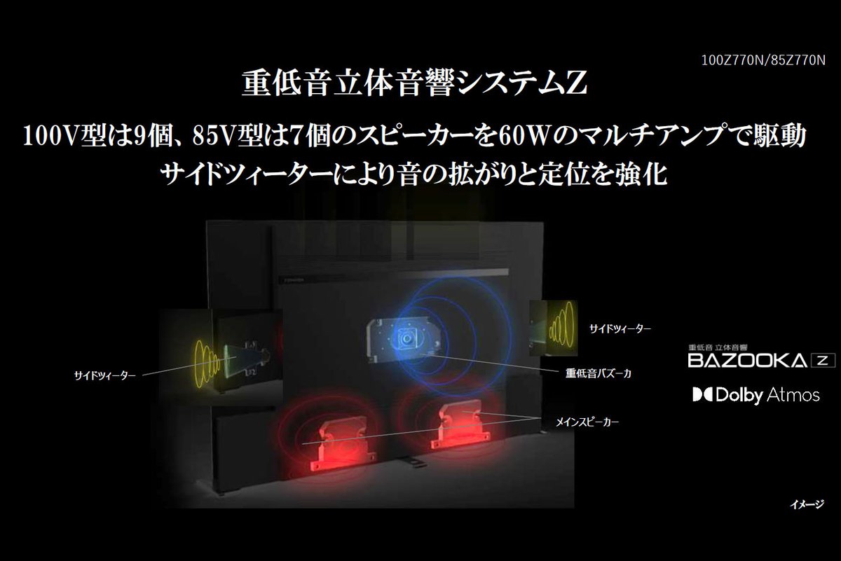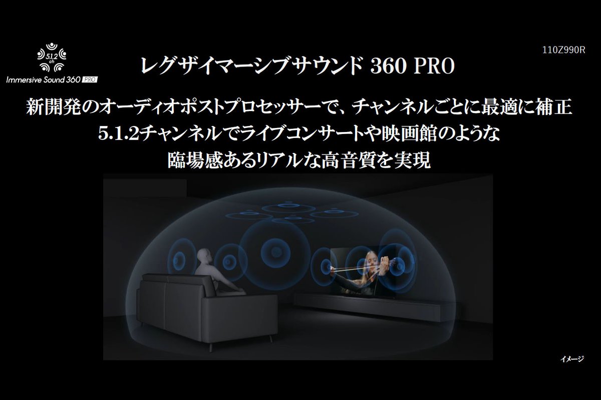 110Z990Rには、新開発のオーディオポストプロセッサーによって、チャンネルごとに音を最適に補正する「レグザイマーシブサウンド 360 PRO」も採用されているため、5.1.2chサウンドの臨場感やリアリティをより一層高めているとしている。