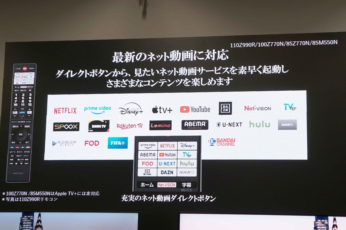 機能面では、多数のVODサービスに対応している点が特徴的であり、YouTube/Prime Video/Netflix/Disney+/Apple TV+/DAZN/TVer/ABEMA/U-NEXT/Hulu/NHK+/WOWOWオンデマンド/FOD/FIFA+/BANDAI CHANNEL/Net-VISION/SPOOX/DMM TV/Leminoに対応する。また付属リモコンには、12個のVODサービスのダイレクトボタンを備えている。