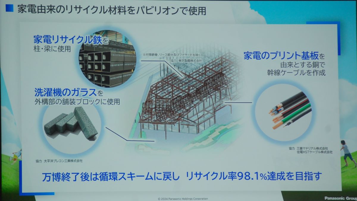 パビリオンの建築にはまた、家電由来のリサイクル材料が使用される。柱と梁には家電をリサイクルした鉄を98%使用。外構部の舗装ブロックには洗濯機のリサイクルガラス。幹線ケーブルで使用する銅はほぼすべてが、使用済み家電のプリント基板からとれる銅を原料としたリサイクル銅線だ。万博終了後は循環スキームに戻し、博覧会協会が目標とするリサイクル率98.1%達成を目指す。