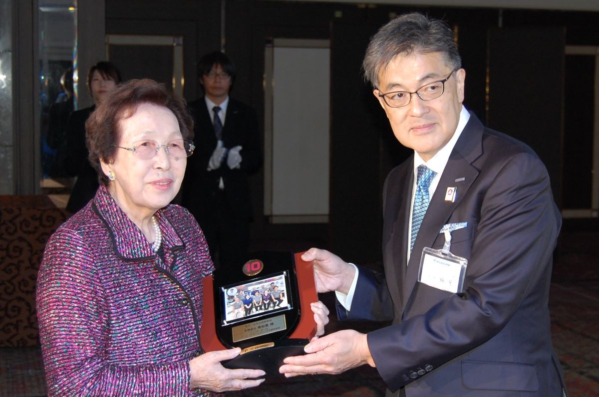 さらに、45ヵ年優秀店1店、35ヵ年優秀店1店、30ヵ年優秀店4店、25ヵ年優秀店3店、20ヵ年優秀店1店、10ヵ年優秀店6店の計21店。45ヵ年から10ヵ年の各店には楠見社長がひとつひとつテーブルを回り、70ヶ年から50ヵ年の各店には壇上で津賀会長からそれぞれ記念の盾が手渡された。