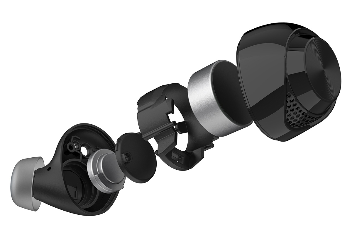 長時間再生とコンパクトなケースを両立するため、独自設計のノズル形状とイヤーピースを採用。ケース内におけるイヤホン本体の占有容積の三次元解析を行い、ボトム形状/ノズル角/ノズル長/イヤーピース形状の最適化を図ったエルゴノミクスデザインにより、優れたスペース効率と高いフィット感を両立。長時間しても疲れにくく、運動時なども外れにくい安定した装着感を可能にしたと説明している。また、イヤーピースには肌に優しい医療シリコンを採用し、優れたフィット感と遮音性の両立を図っている。