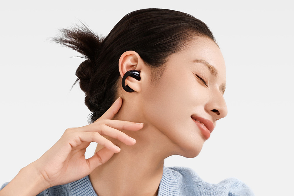耳をふさがず、外耳を挟むように装着するイヤーカフタイプの完全ワイヤレスイヤホン。身の回りの音も聞き取りつつ開放的な音場を楽しめると同時に、アクセサリーとしてのデザインと装着性も重視したという。